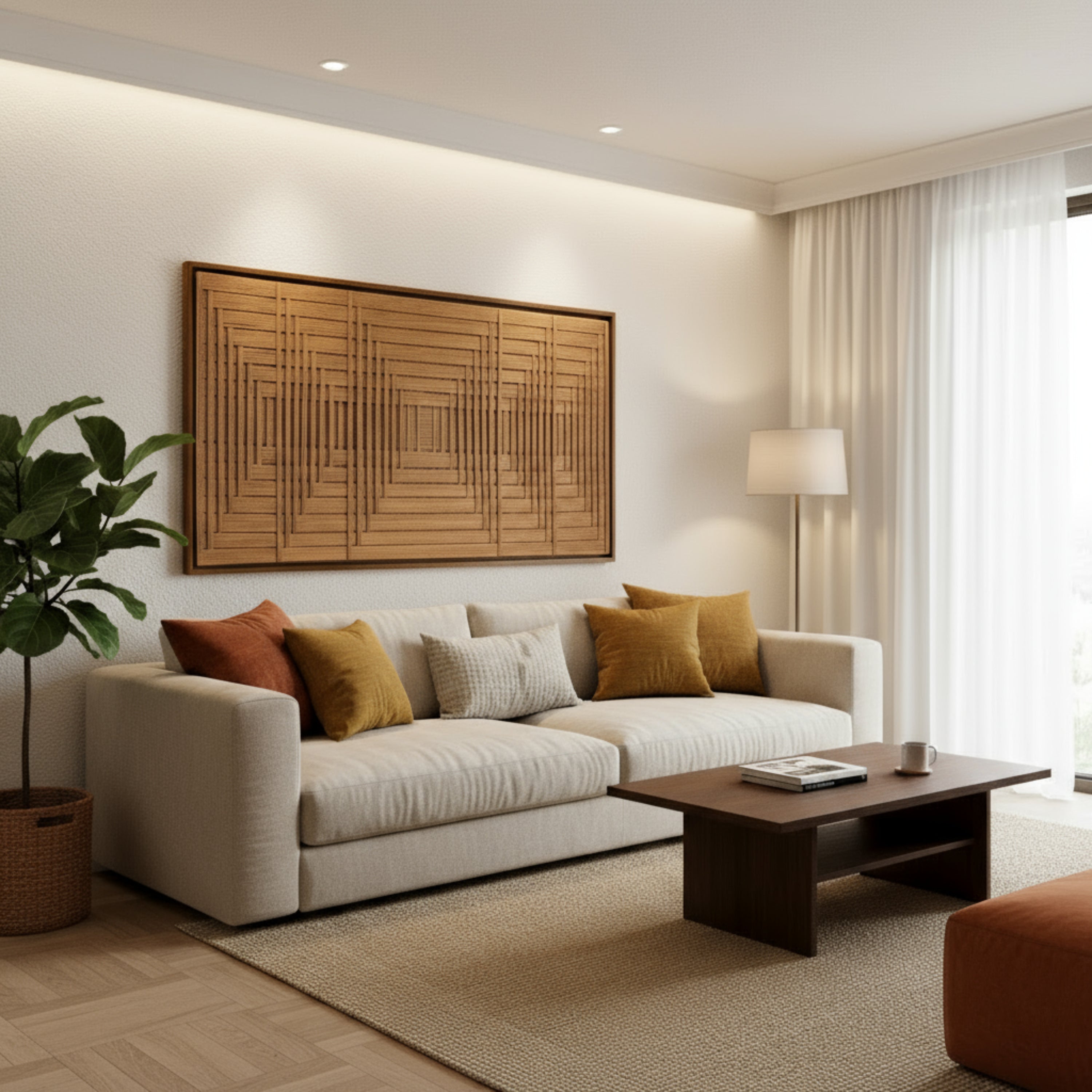 ECOS es una pieza de arte textil hecha a mano, elaborada con hilos de algodón cuidadosamente tejidos sobre un elegante cuadro veneciano. Su diseño en relieve 3D crea una composición visual envolvente que aporta textura, profundidad y carácter a cualquier espacio.