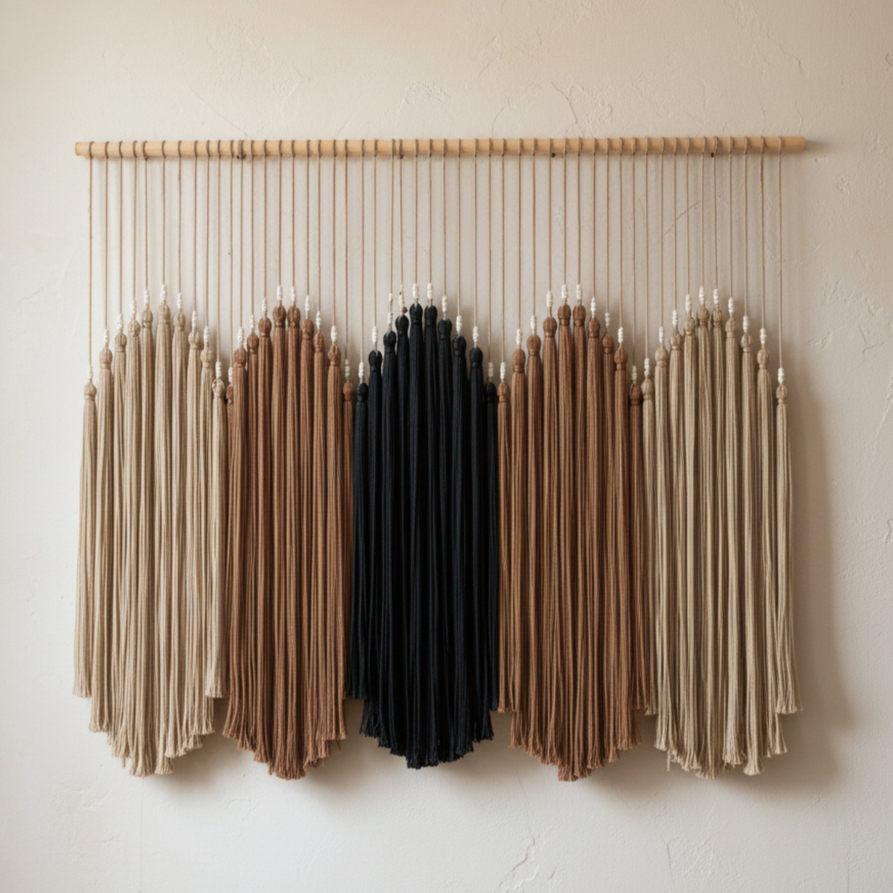 Su estructura cuenta con un soporte de madera natural, que realza el movimiento y caída de los hilos, creando un efecto visual tipo cascada ideal para salas, recámaras, oficinas, hoteles o cualquier espacio que busque un estilo boho chic, contemporáneo o minimalista.