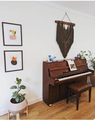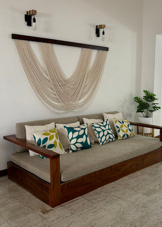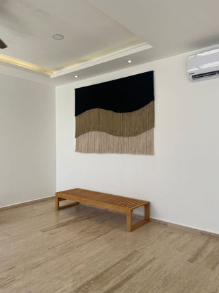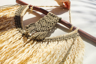Decora con nuestro tapiz de macramé hecho de algodón y tronco de madera. Fabricado íntegramente a mano, por nuestros artesanos en Yucatán, México.